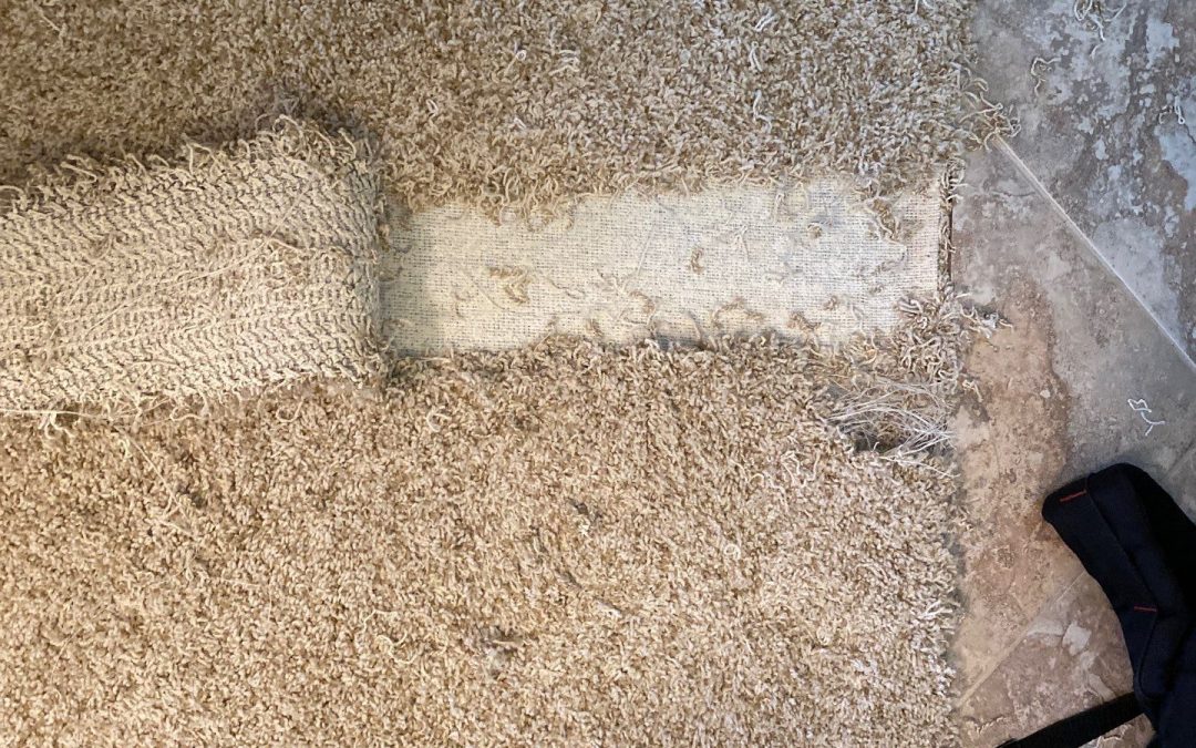Pets can be lovable companions, but sometimes they leave behind unexpected damage—especially to carpets near high-traffic areas like doorways and tile transitions. Recently, our team at Carpet Repair Tempe handled a case where a dog had chewed a section of carpet near a tile floor, causing the carpet to delaminate and require a larger repair than initially visible.